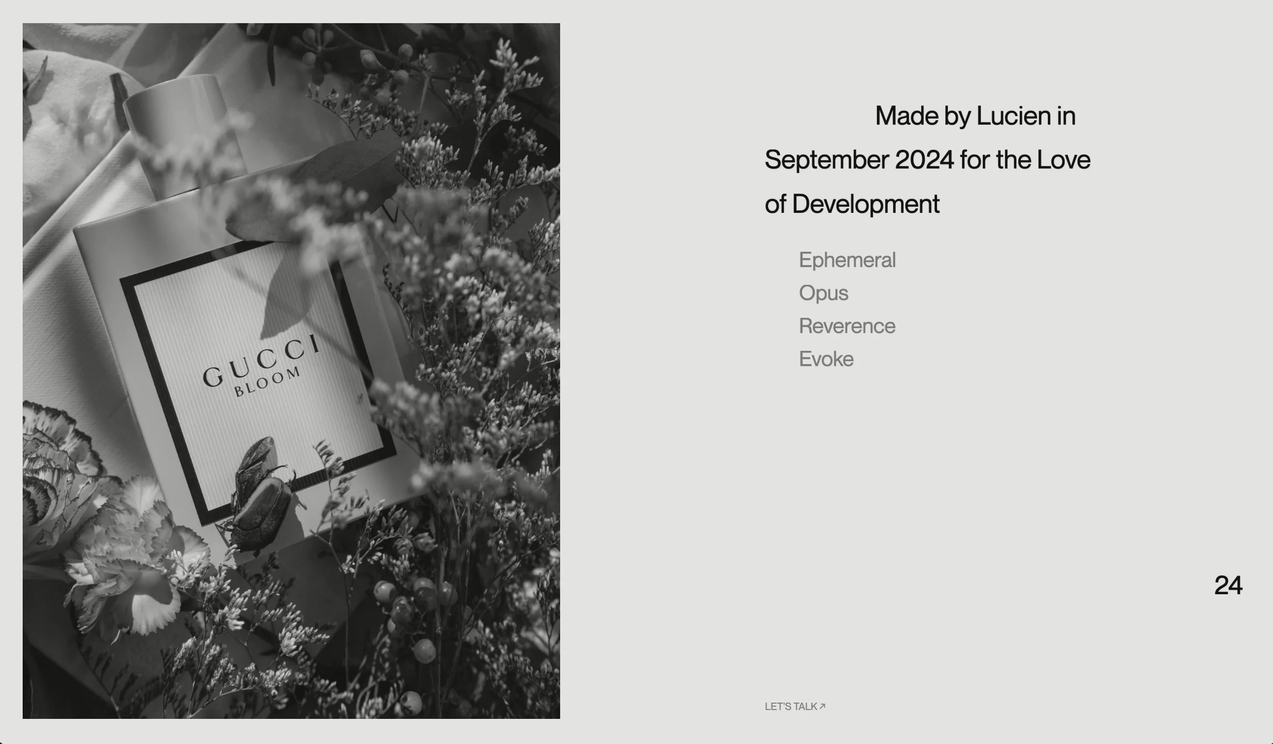I was the web designer and developer, I sought to create an experience that is profoundly simple yet deeply immersive. Every motion, every transition is deeply considered—crafted from scratch; no libraries, no frameworks but simply native web GL and vanilla JS. The same way an engineer builds with basic elements like glass, timber and concrete.